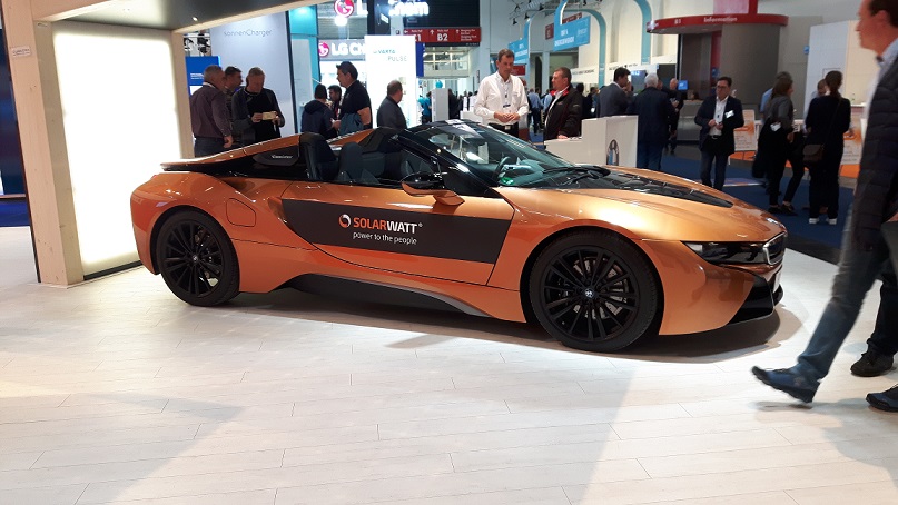 Электрический BMW, над ним надо присмотреться и увидеть крыша парковки с солнечными панелями для зарядки.