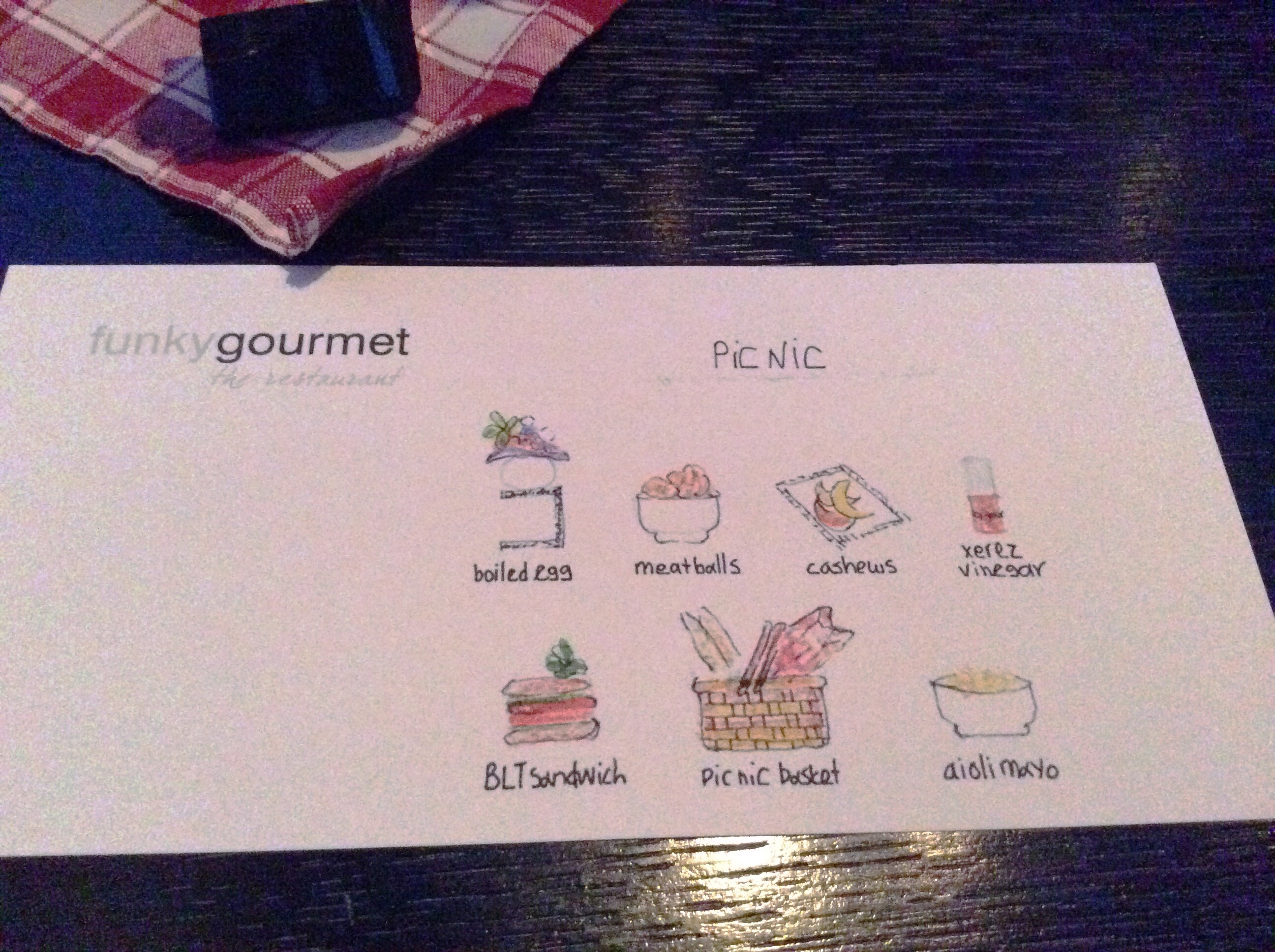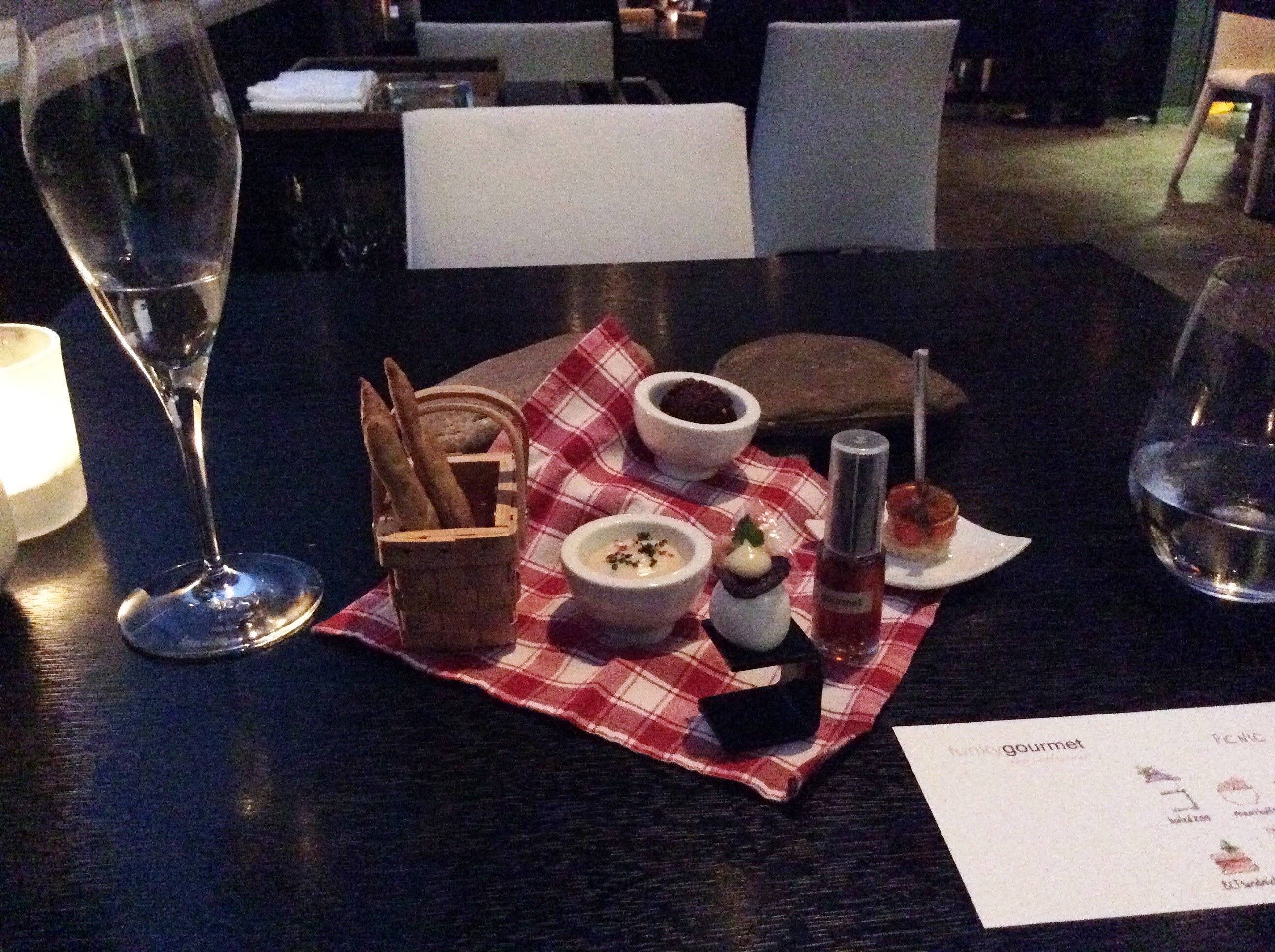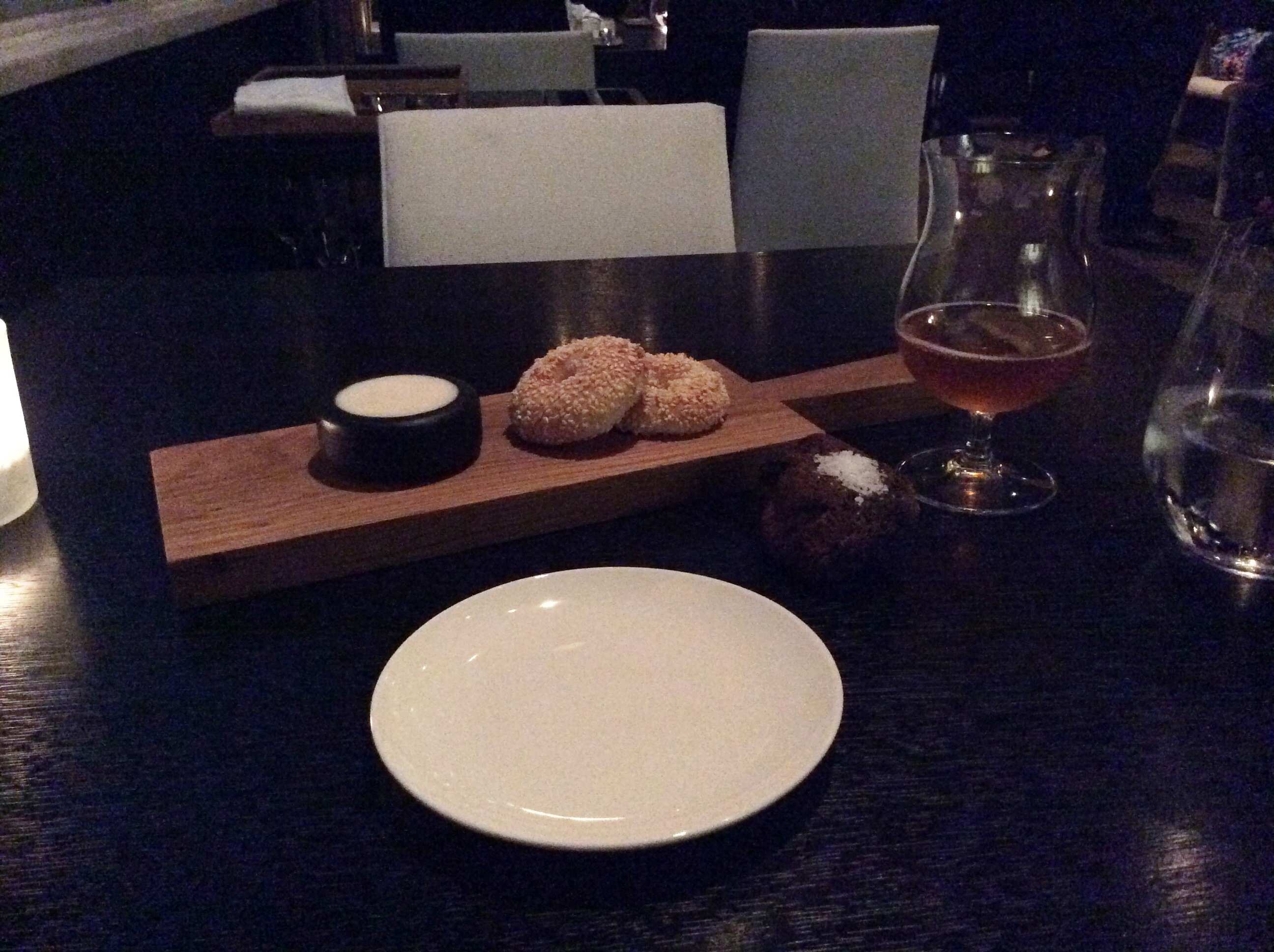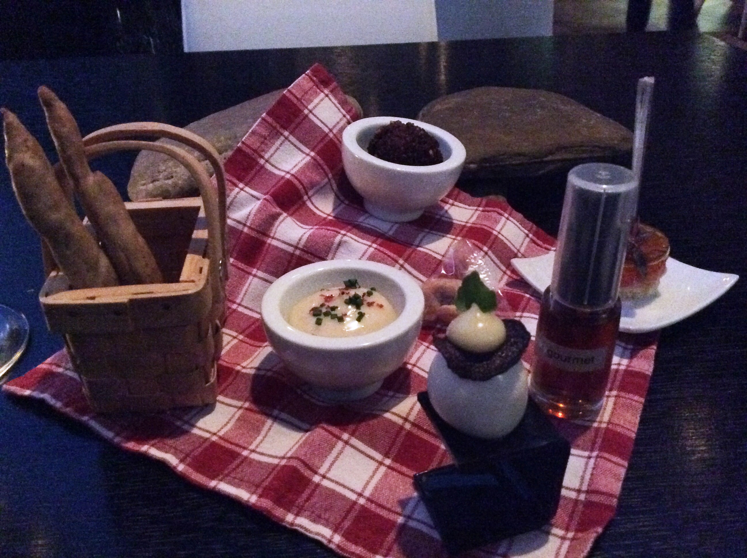 Багеты размером тоньше мизинца, сэндвич на зубочистке. Верхний слой сендвича - взбитый в мусс и желированный бекон. Кешью в пакетике на первый взгляд целлофановом, а на поверку съедобном. Сваренное всмятку перепелиное яйцо с каким-то черным соусом, которое надо сначала сбрызнуть уксусом малиновым (а на бумажке написано, что уксус из хереса... обманули?)... Мясной шарик шефталакия, чесночный майонез в плошке