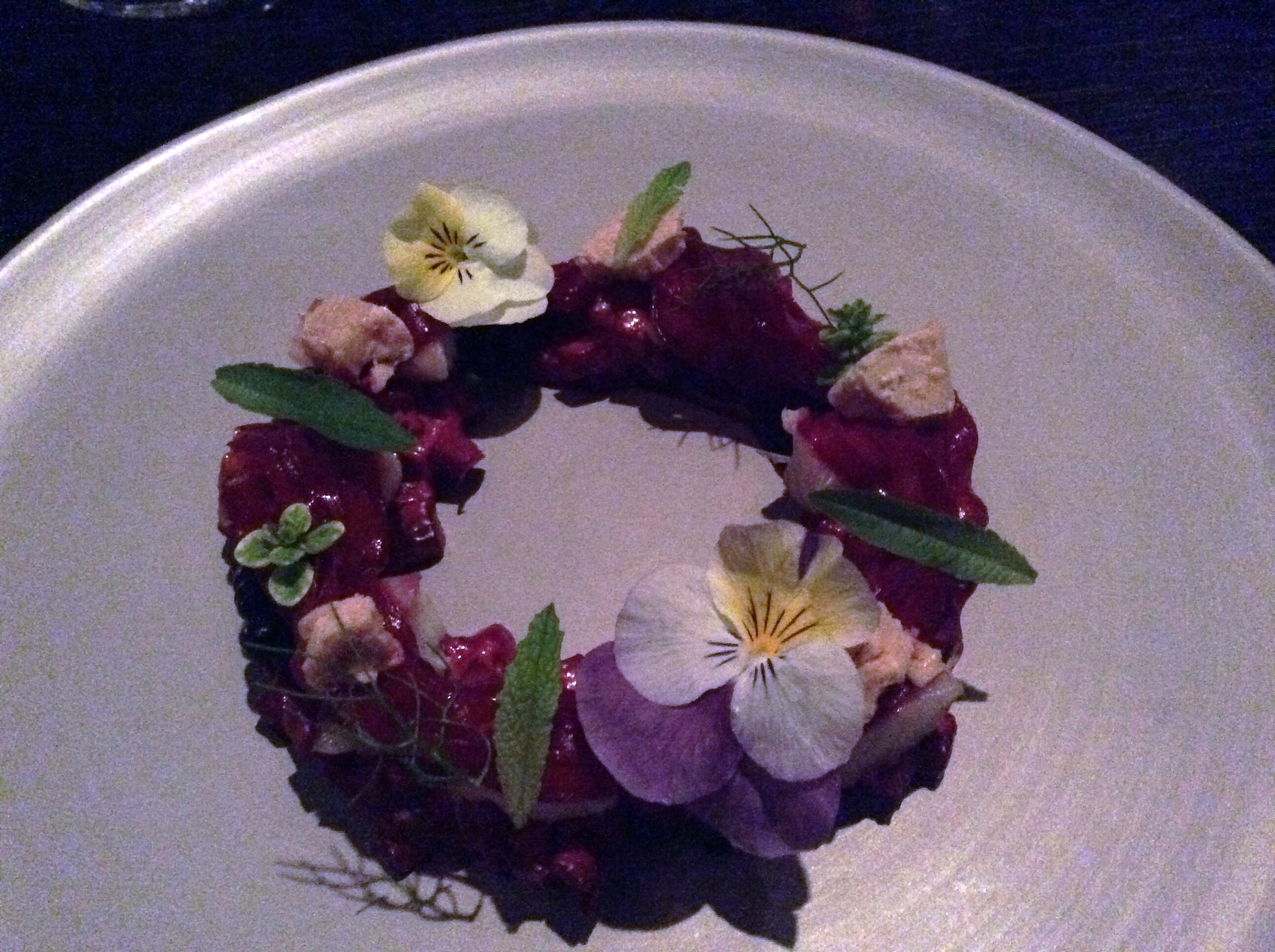 Эта красота в меню называется Весенний венок. По факту салат из свеклы, приготовленной 3мя разными способами (вареная, подкопченая и еще какая-то), и маленькие кусочки нежнейшей селедки. Когда поддеваешь это вилкой, свекла гирляндой выглядит. Или как кружево. Как они это так порезали? Совершенно непонятно. Ну и конечно же очень вкусно! Аккомпанемент - розовое вино.