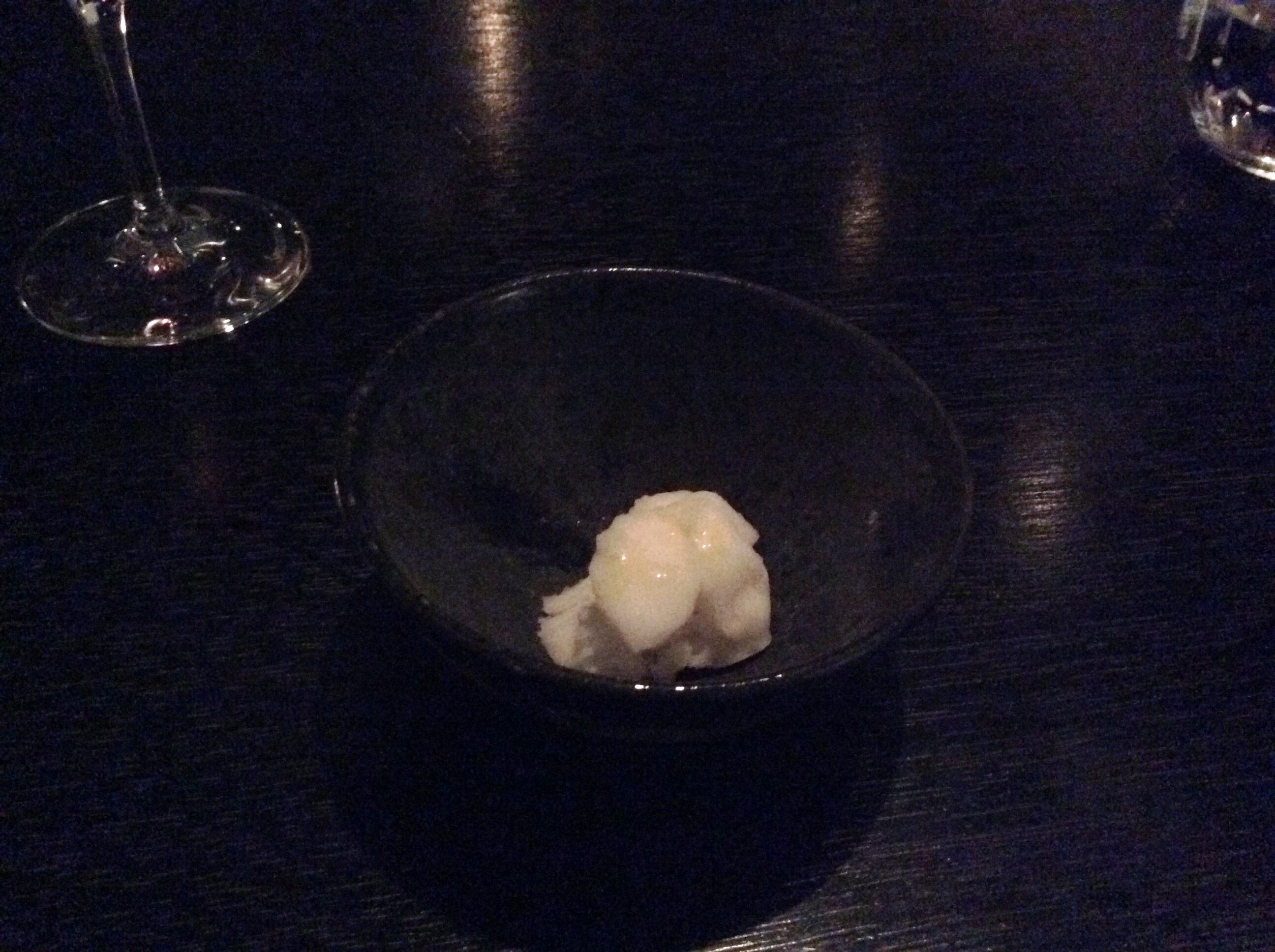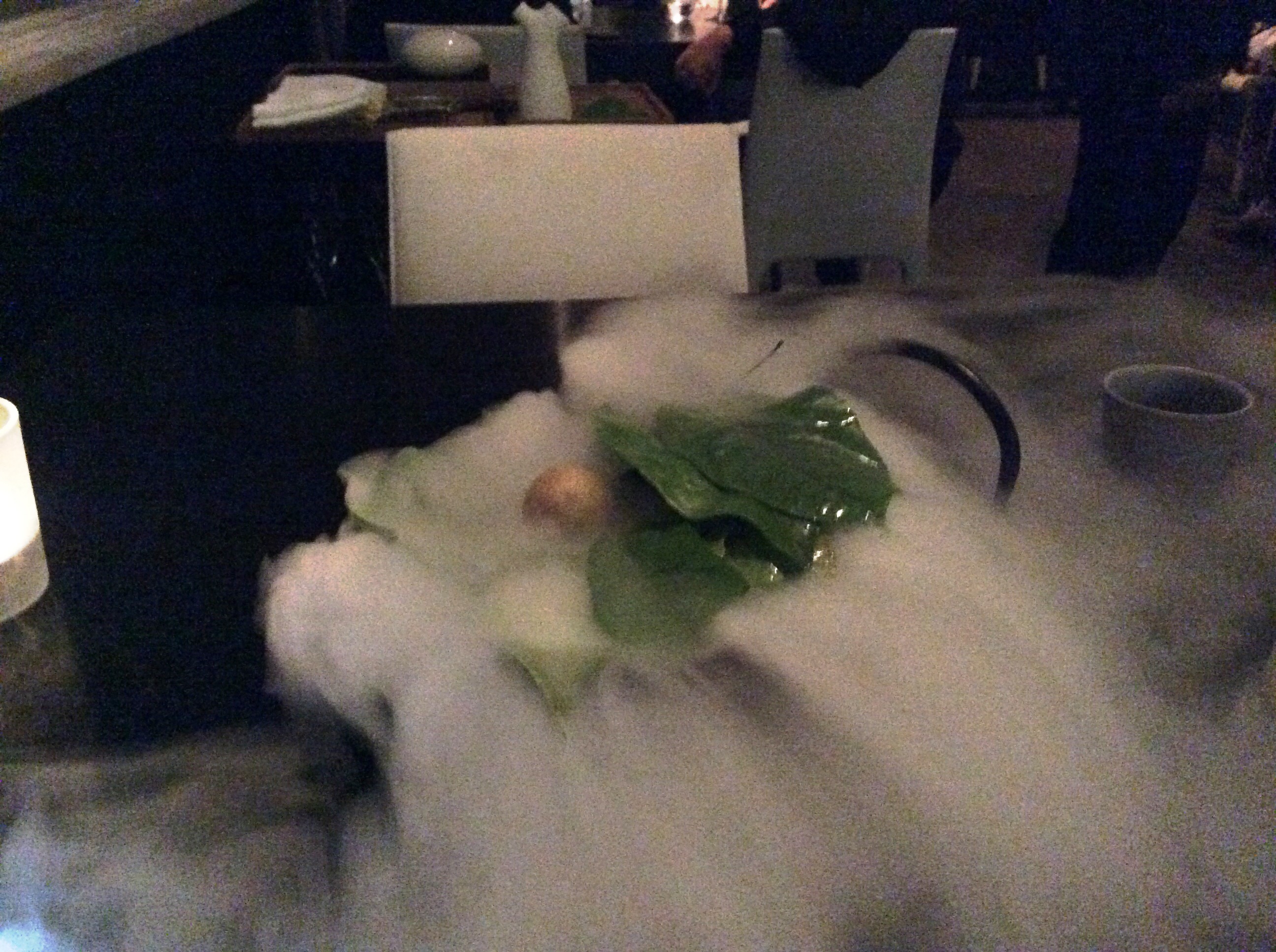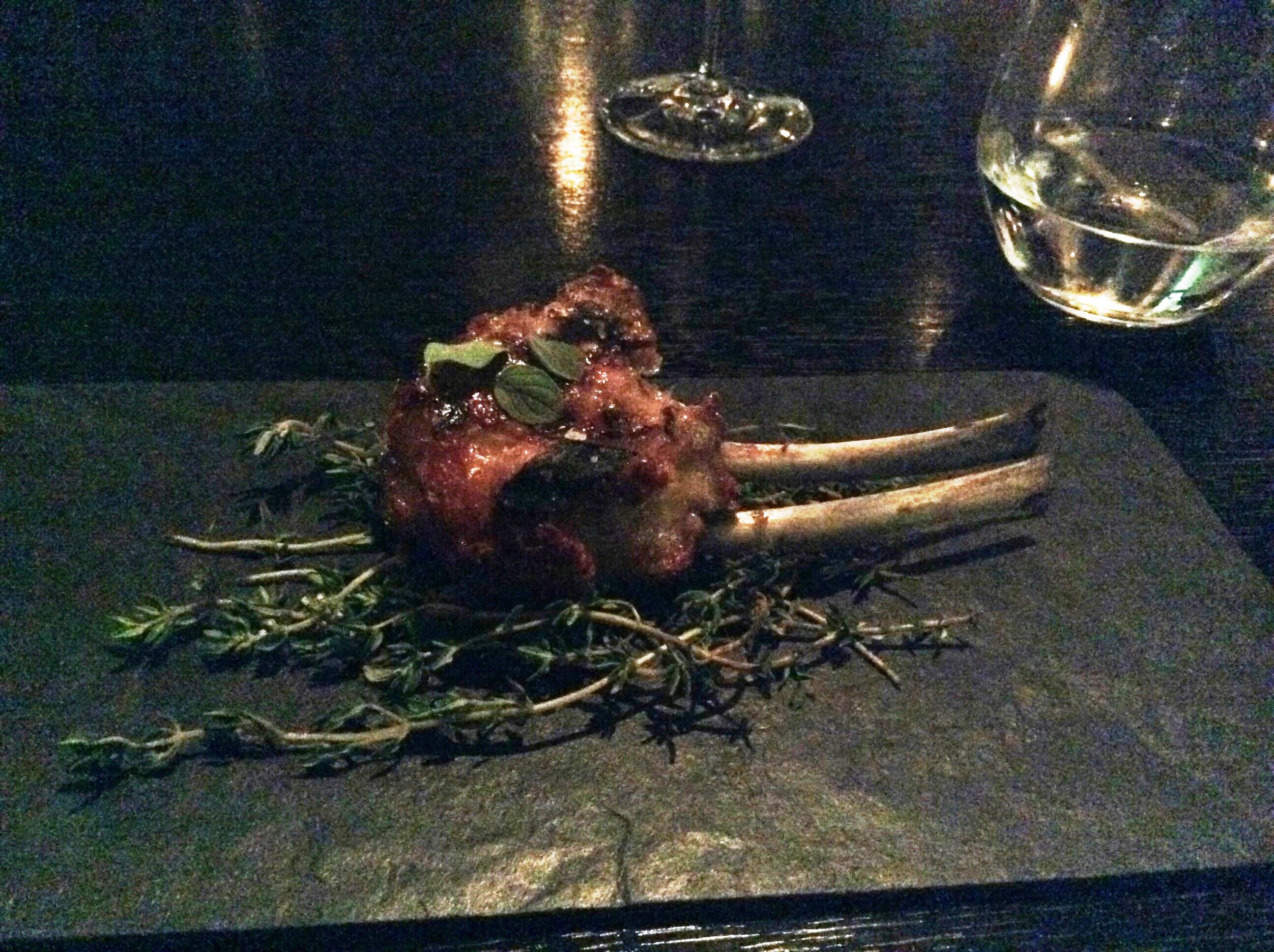 Карэ ягненка. Очень маленькие кусочки мяса на маленьких косточках. Сколько-то часов томилось в печи, а потом обжарилось на гриле. На подложке из розмарина. На этом месте у меня начали сдавать силы. Не смотря на то, что блюда реально на зубок - очень маленькие порции. Фотка получилась совсем плохая - света в ресторане не было практически. Полумрак.