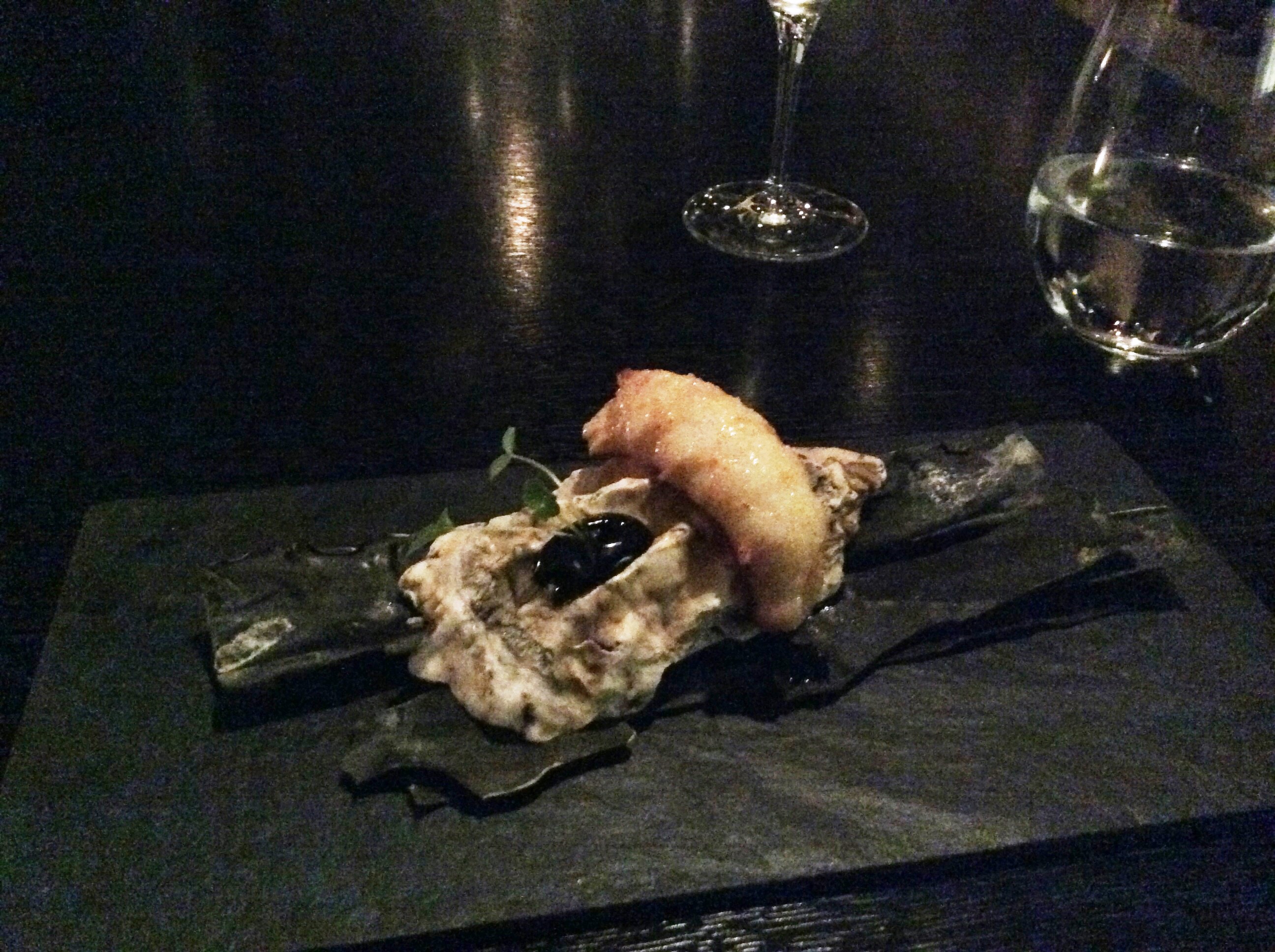 Следующее блюдо тоже очень красивое и вкусное. Водоросли какие-то в кляре, воткнутые во что-то воздешное. Водоросли, как говорит гугл, оказались сальсифи или козлобородник или овсяный корень. Судя по описанию, это он и есть. "Нежный приятный, едва уловимый устричный вкус"... Субстанция оказалась тарамасалатой, взбитой в мусс и безумно нежной. Моя фраза "это же тарама", напрягла официантку. Она удивилась. Пришлось успокаивать, что я не имею отношения к экспертам мишлена, а просто на Кипре живу и слегка в курсе.