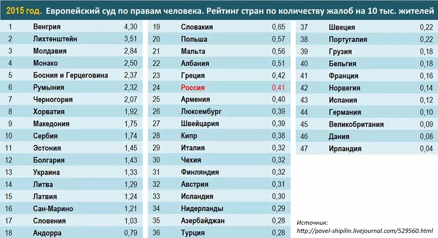 Я эту реплику опубликовал для того, что бы пожилые пенсы не верили всему, что написано в газете, даже если она себя называет новая. И вовсе не для того, что бы обидеть члемовичей и шкваловичей, что жители их Украины в прошлом году обращалась в ЕСПЧ в три раза чаще, чем жители России. Коночного все плохо в России, я не спорю, раз даже алексалекса либерасты охмурили как Козлевича из Золотого телёнка ксензы. Таблицу взял у Павла Шипилина, можно погуглить.
