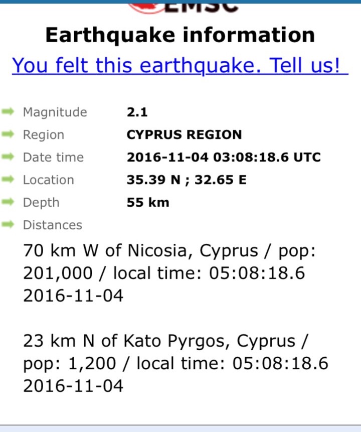 Толчков, оказывается, было даже два, в разных местах и совершенно невинных с точки зрения кипрской сейсмологии. Думаю, российские новости скоро сообщат о землетрясении в Лимассоле :)