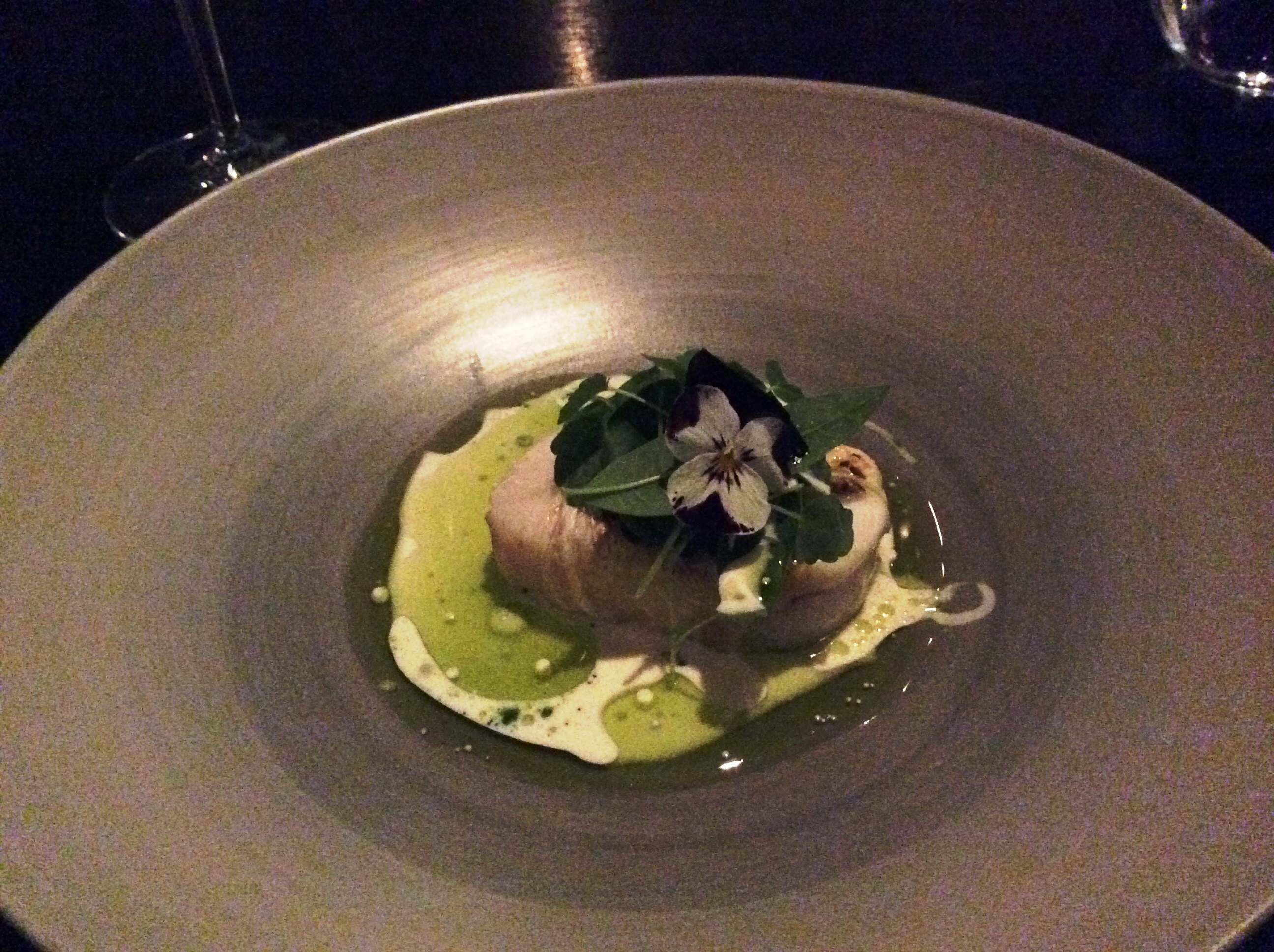 Улитки. Что там они сделали с улитками, я не в курсе. Судя по названию, с земными ароматами. Мне показалось, что там присутствовала даже перловка. К улиткам подавали белое Sauvignon blanc fume. Почему фюме (с дымком) я не знаю, но чертовски вкусно!