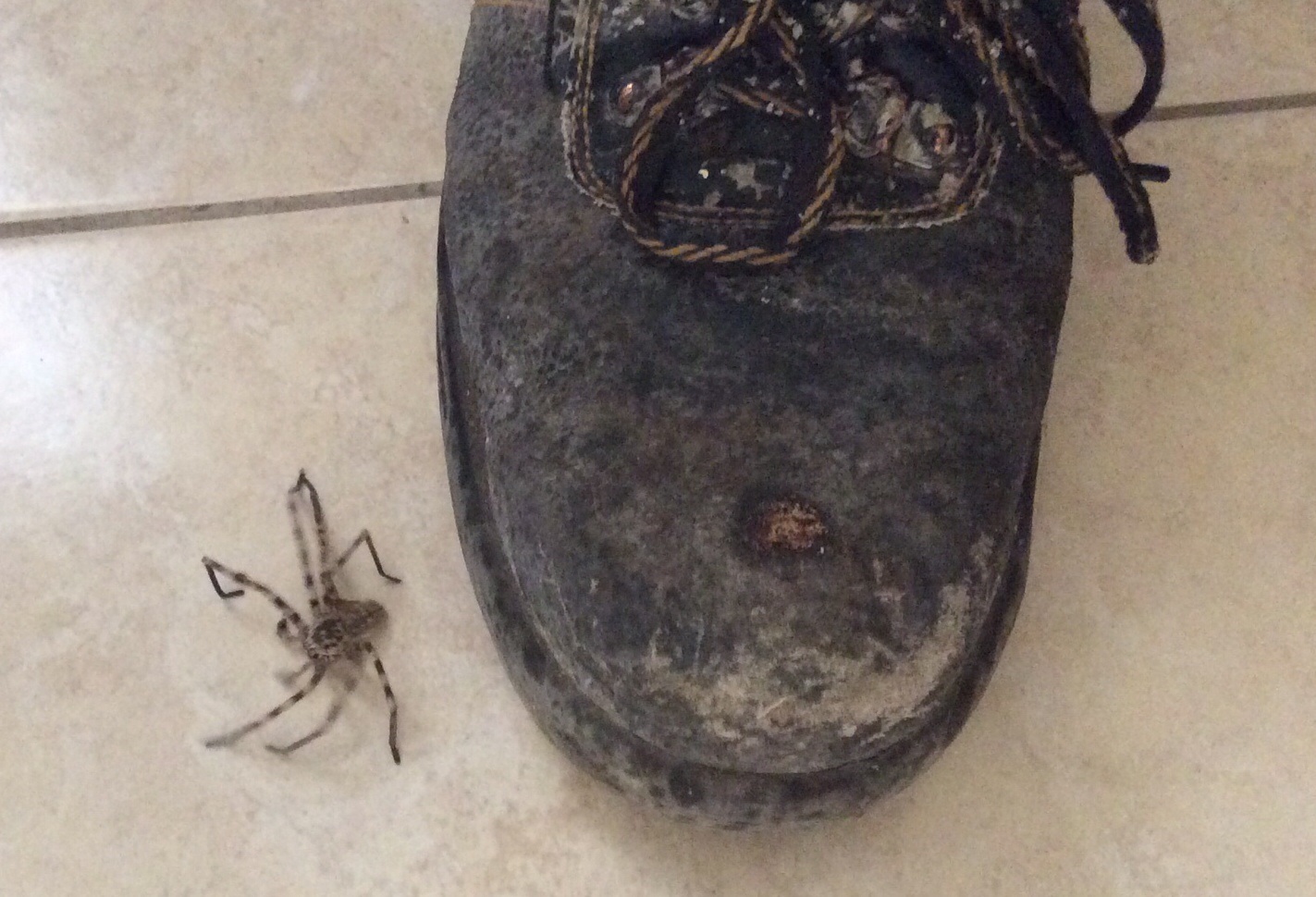 Вот эта дрянь свила гнездо у меня в доме. Для сравнения на фото башмак мужика 43 размера. Он этого парня у меня в диване и обнаружил. Вместе с женой и кладкой яиц