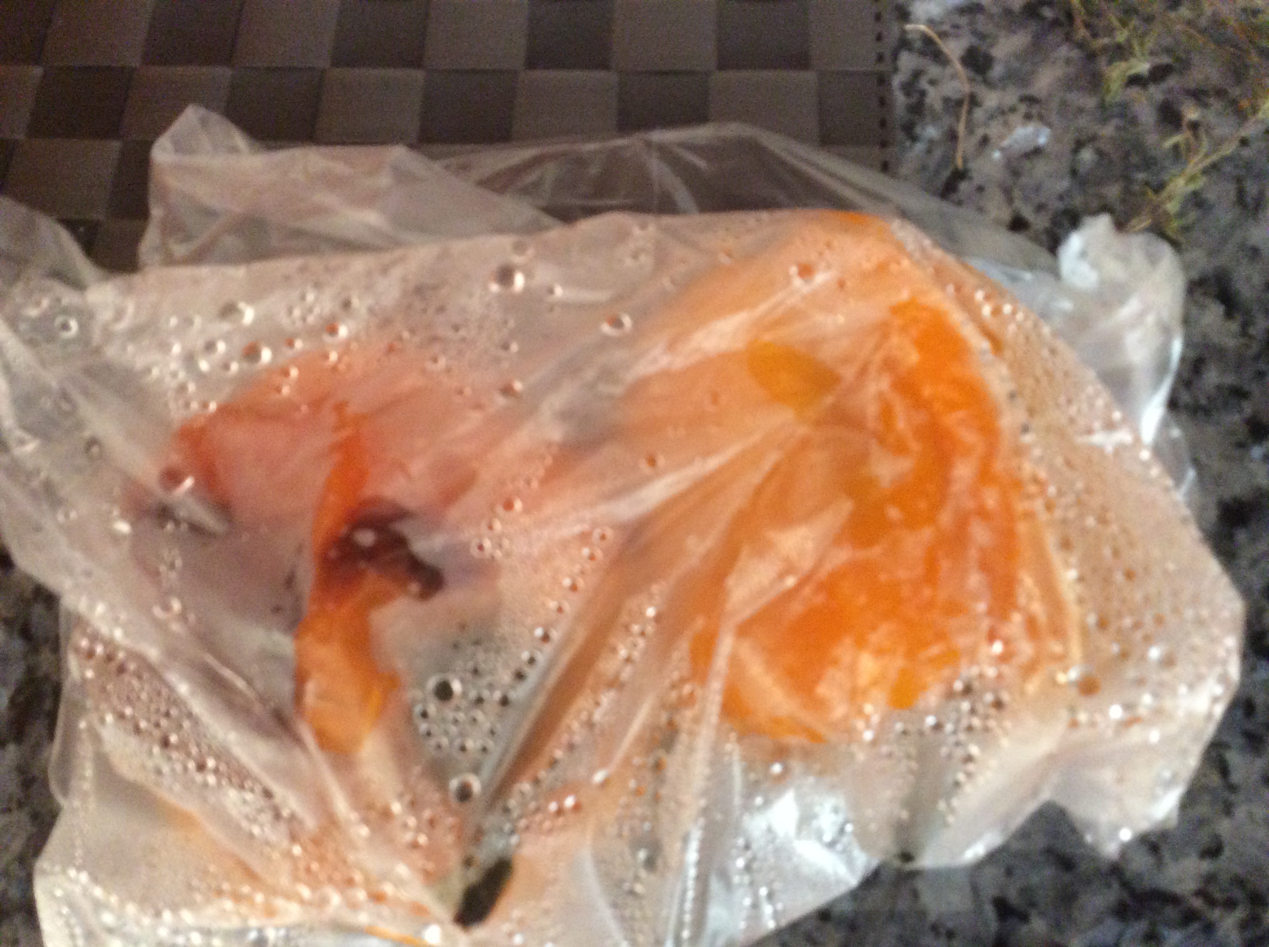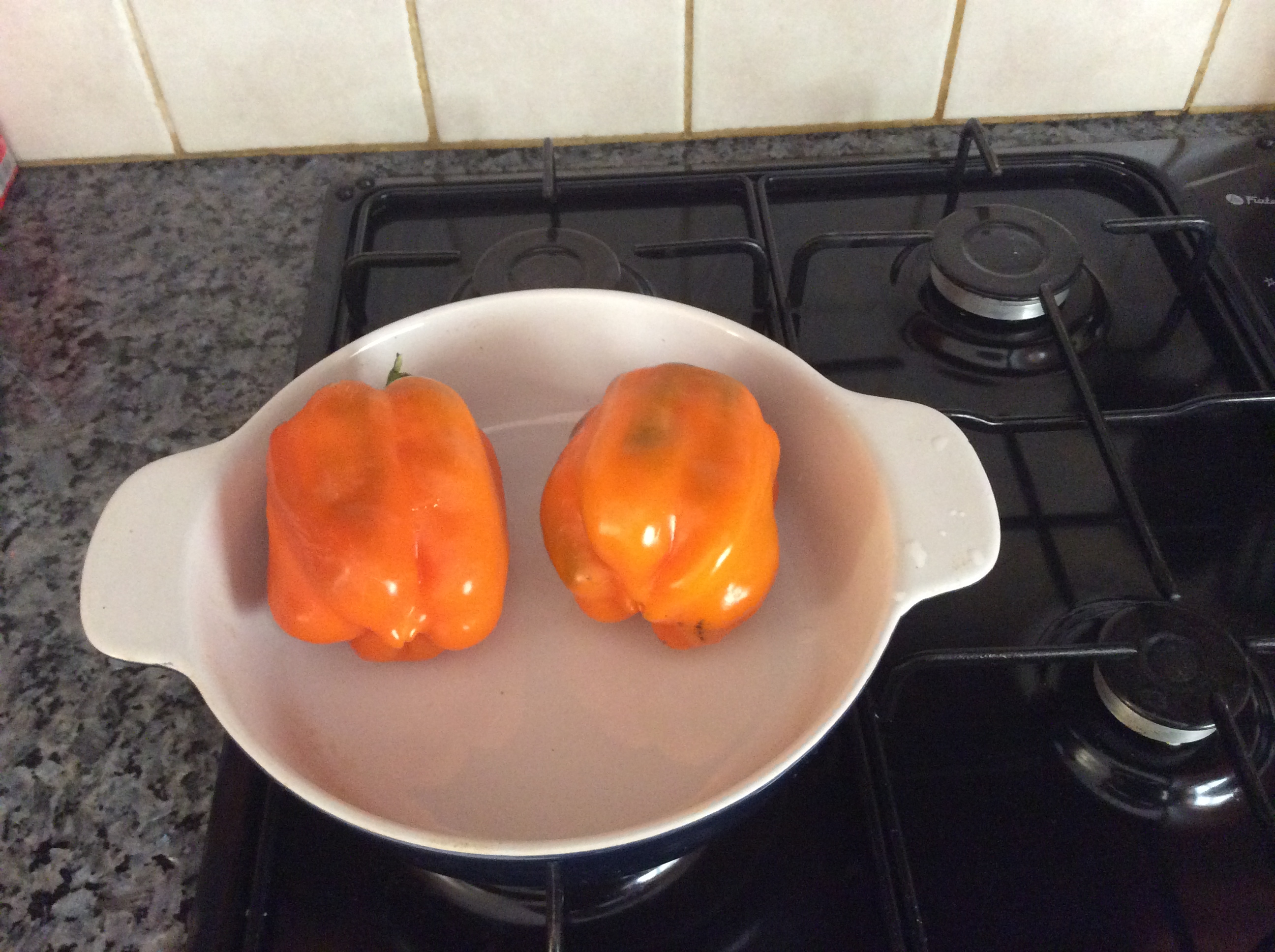 Для этого перец ставим в духовку на 180-200 градусов и запекаем минут 30, чтобы кожица начала трескаться и пузыриться. Затем его достаем и оставляем остужать в пакете. Кожура после этих процедур легко сходит.