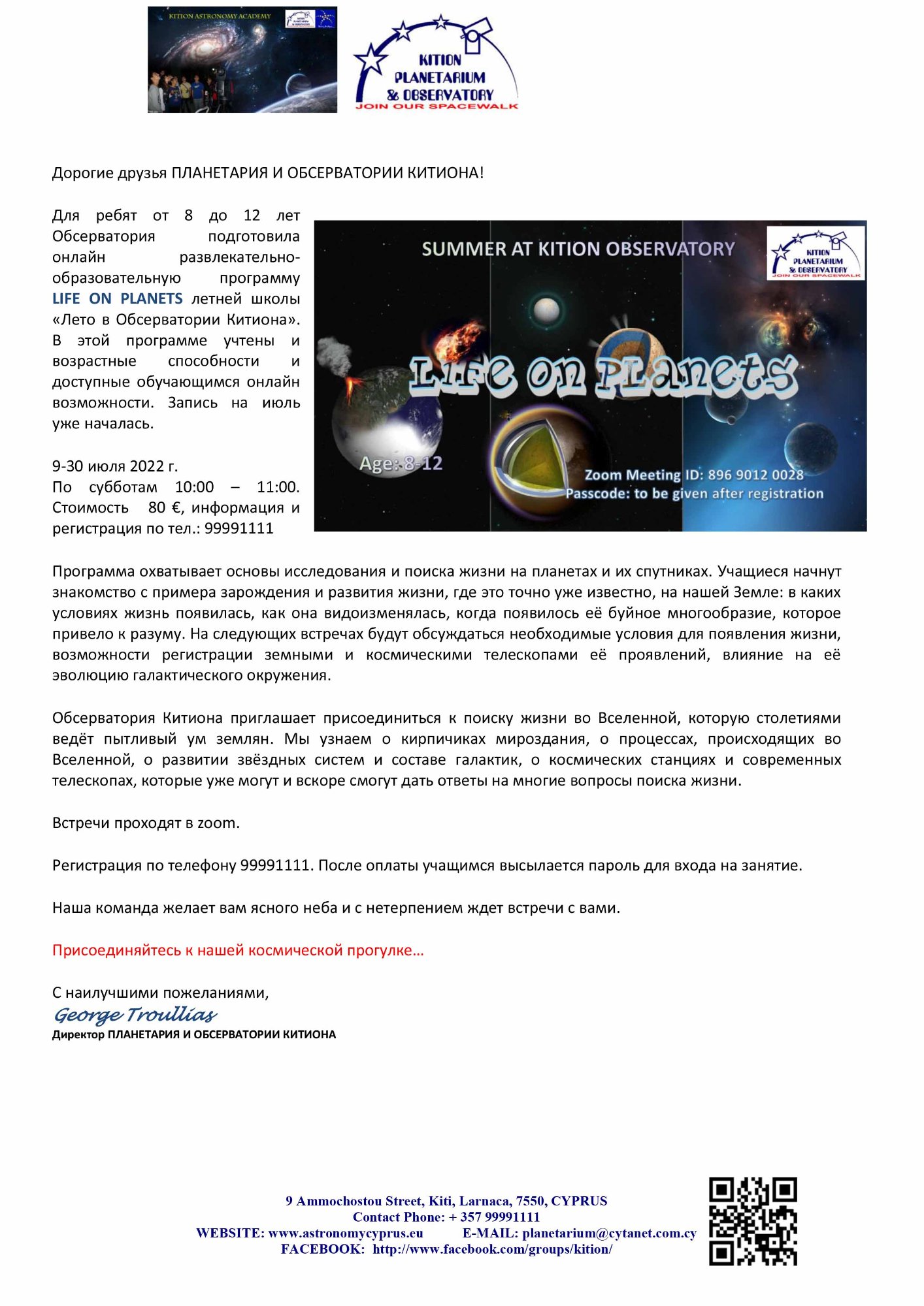 Для ребят от 8 до 12 лет Обсерватория подготовила онлайн развлекательно-образовательную летнюю школу «Лето в Обсерватории Китиона». В программе Life on Planets учтены и возрастные способности и доступные обучающимся онлайн возможности. Запись на июль уже началась.