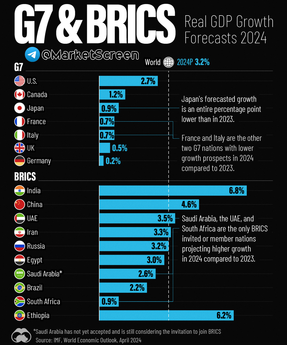 Страны БРИКС по-прежнему имеют значительно более высокий средний прогноз роста на уровне 3,6% по сравнению со средним показателем G7 в 1%.