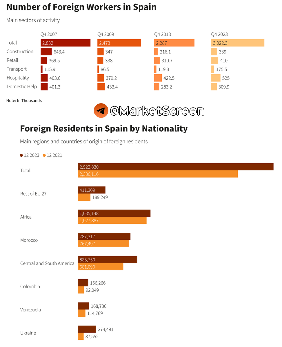 Волна мигрантов, большинство из которых имеют документы и разрешения на работу, увеличила долю иностранцев, постоянно проживающих в Испании, до 18,1%, что выше среднего показателя по ЕС в 13,3%. По данным Funcas, 39% новых граждан Испании родились в Латинской Америке.