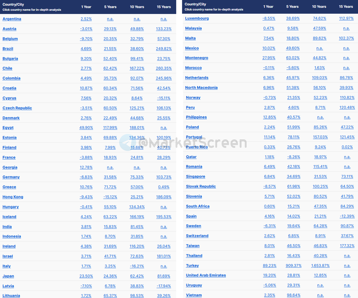 Как менялись цены на недвижимость в разных странах за 1, 5, 10 и 15 лет.